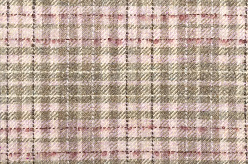 バーガンディのループヤーンや、トープやオフホワイトのスライバー、ラベンダーやフレンチバニラ、オリンピアンブルーの混ざるスモーキーモスのウールヤーンなどを縦横に行き交わせてチェック柄を織りで表現した逸品。