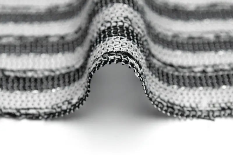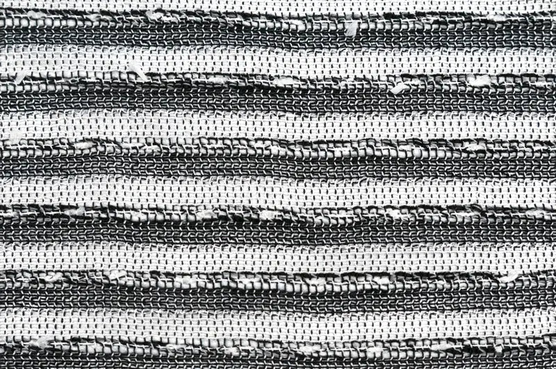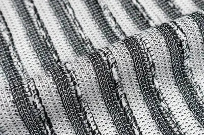 ホワイトのふっくらとしたスライバーや、1cm程の毛足のリボンヤーン、ライトグレーのスライバー、シルバーのラメ糸、ブラックの普通糸等を縦横に行き交わせた逸品。