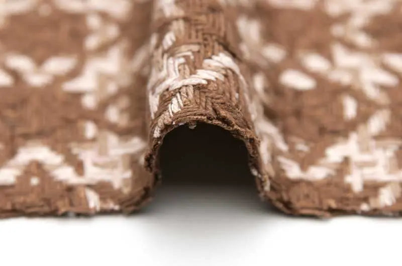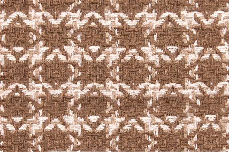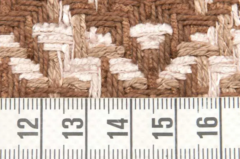 オフホワイトやピンクミスト、カフェオレ、コーヒー、クローブ等ブラウン系と柔らかな色合いでまとめ、幾何学柄を表現した逸品。