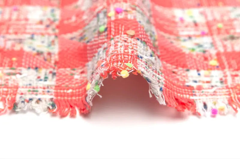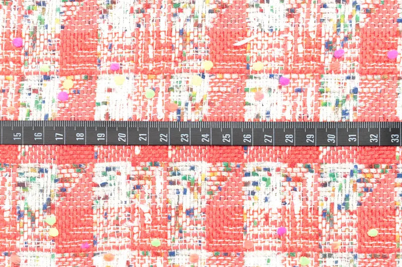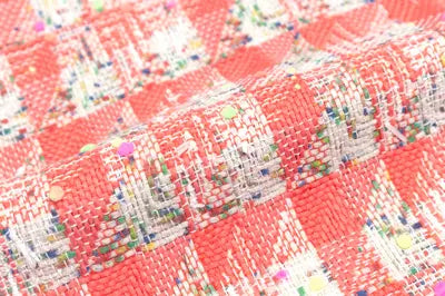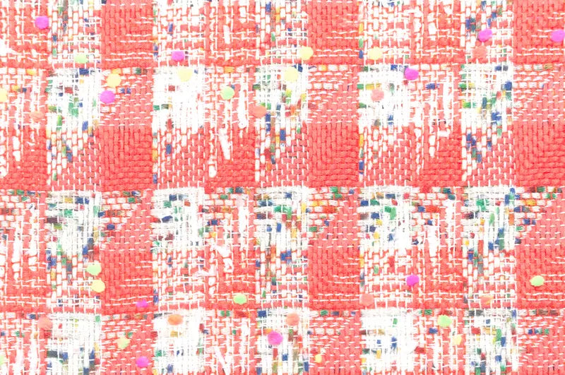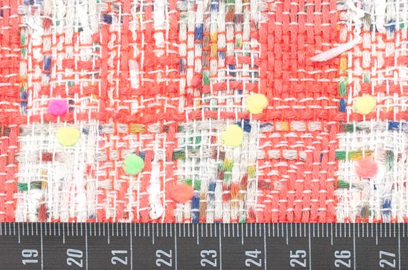 コーラルレッドとホワイトのニットヤーン、ターコイズグリーン、シトラス、パンジー、ブリックレッド等でプリントしたホワイトのニットヤーンを縦横にチェック状に行き交わせたベースに、ブーゲンビリアやネオングリーン、ネオンオレンジ、ネオンイエロー等の細かなポンポンをあしらったポンポンヤーン、ホワイトのリボンヤーン等織り込んだ逸品。