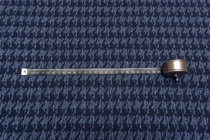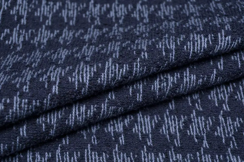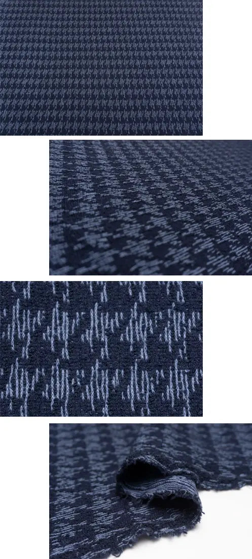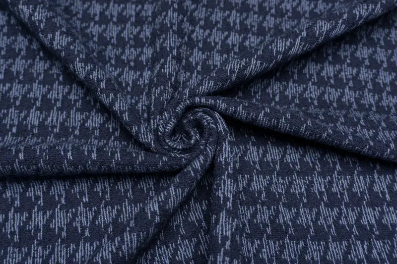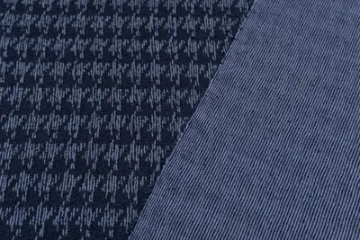 サルビアブルーのジャージーに、スモーキーネイビーのリングヤーンを織り込み、千鳥格子柄を表現した逸品。