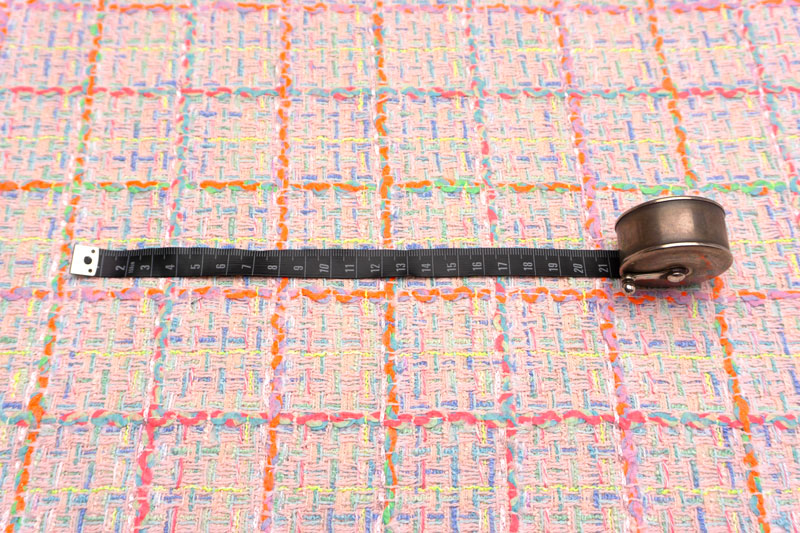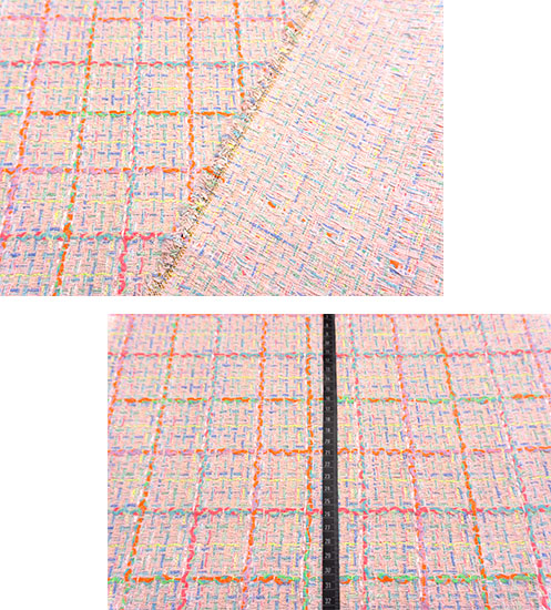 ピンクミストの甘撚り糸やグログランヤーン、ホワイトとオペラのツイストヤーン、ネオングリーンレモンのスパイラルヤーン、オパールグリーンからサルビアブルーへ変化するリングヤーン、ホワイトのフラッグヤーン等を縦横にゆったりと行き交わせたベースに、ネオンピンクやネオンオレンジ、ターコイズブルー、ネオングリーン、ラベンダーの不織布ヤーン、光沢のあるピンクミストのニットヤーンを用いて、縦4.5cmx横4cmのチェックを表現した逸品。