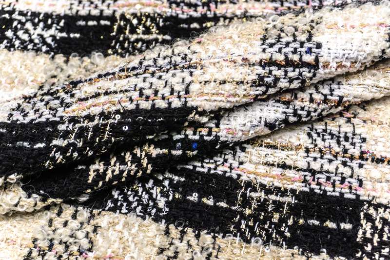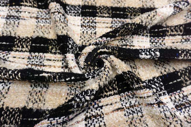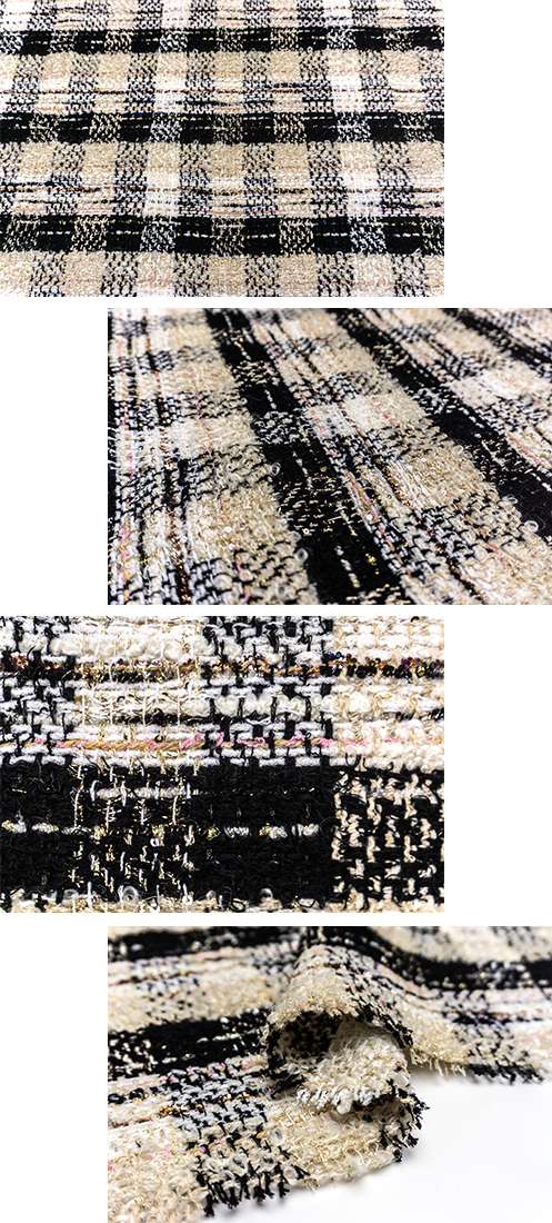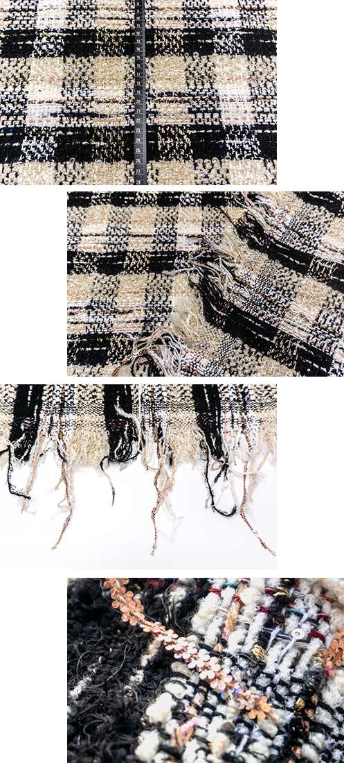 ホワイトのチュールヤーンやリングヤーン、オフホワイトのリングヤーン、バニラの撚り糸にベゴニアピンクの糸があしらわれたヤーン、花の形をしたゴールドブロンズのスパンコールが連なるヤーン、シルバーのスパンコール、エクリュベージュのループヤーン、ゴールドラメのフリンジヤーン、ローヤルブルーのスラブがあしらわれたブラックのニットヤーン、ブラックのフリンジヤーン等、実に様々なファンシーヤーンを縦横に行き交わせて、チェック柄を表現した逸品。