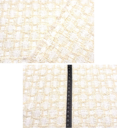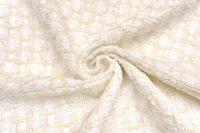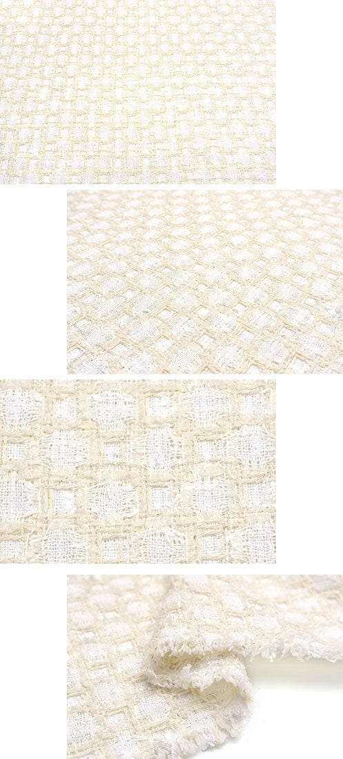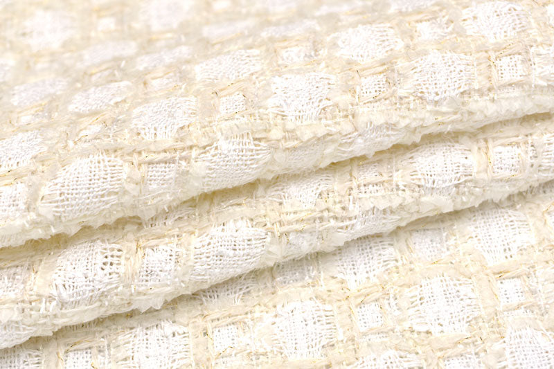 オフホワイトの普通糸やクリームベージュのフラッグヤーン、ゴールドラメを絡めたクリームの甘撚り太糸、透明のティンセル ヤーン等を縦横に行き交わせて、ハニカムチェックを織りで表現した逸品。