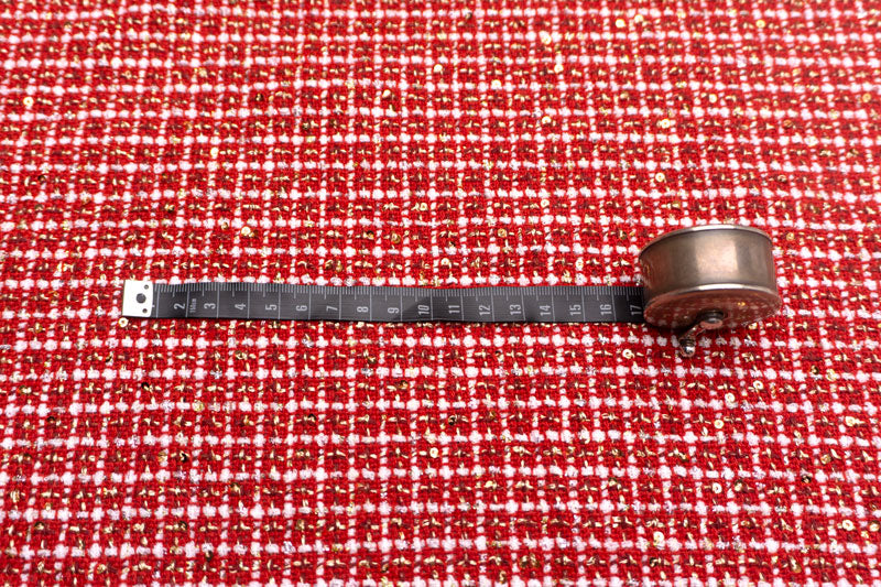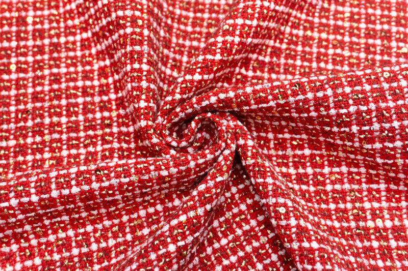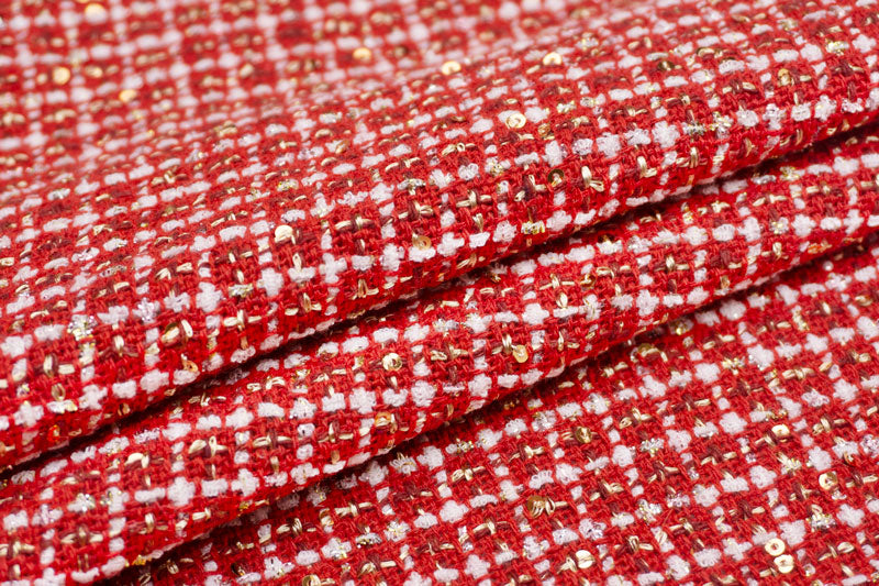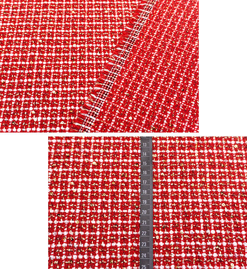 オーロラレッドとボジョレーを用いたベースに、ゴールドラメを等間隔に巻き付けたホワイトのラダーヤーンや、ゴールドのスパンコールヤーンをチェック状に行き交わせた逸品。