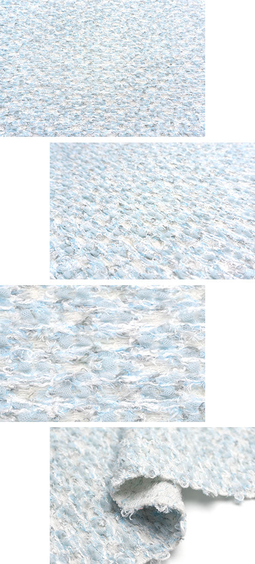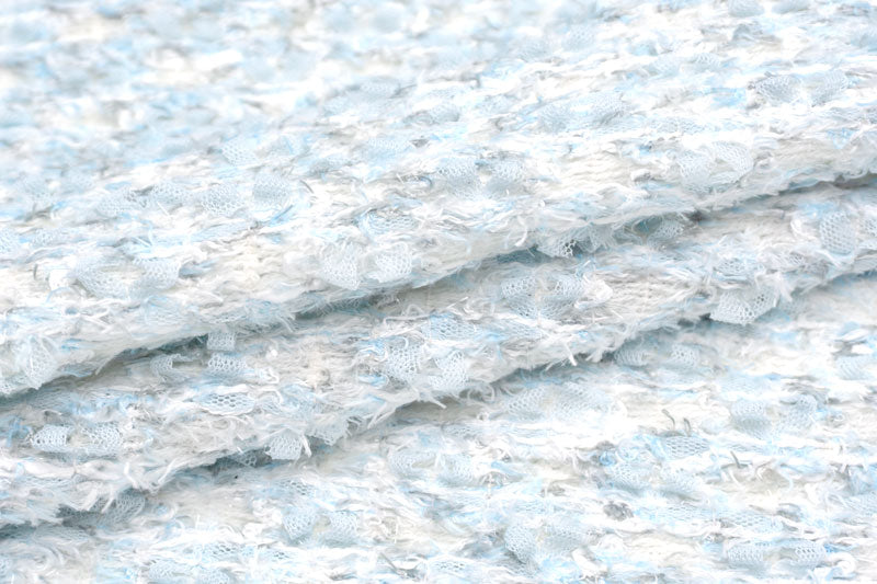 ホワイトやスモークブルー、透明の毛足を持つスパイラルヤーンや、フロスティブルーのチュールヤーンを縦に並べ、オフホワイトの甘撚り糸を横に用いた逸品。