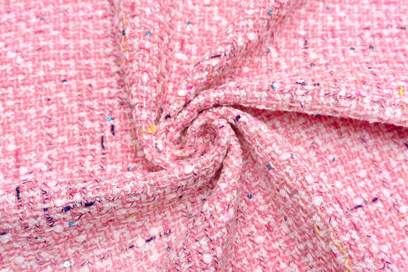 ポップな色合いに、ポンポンときらめくスパンコールが賑わいを添えている、華やかなお生地。