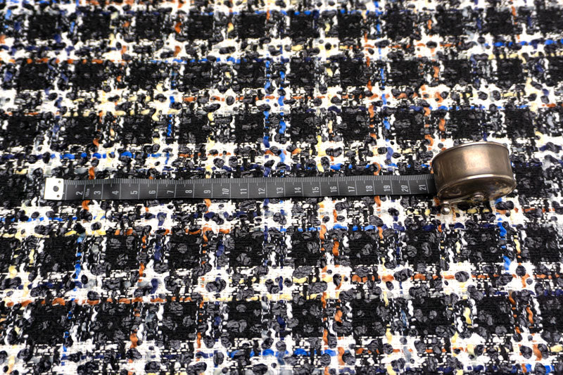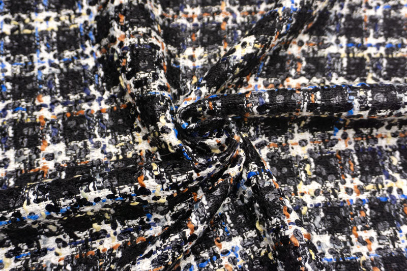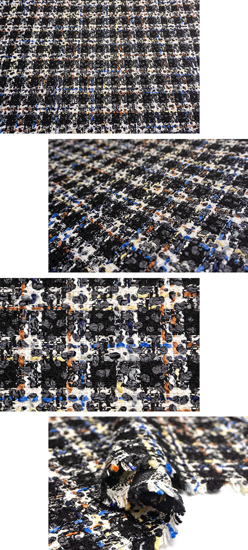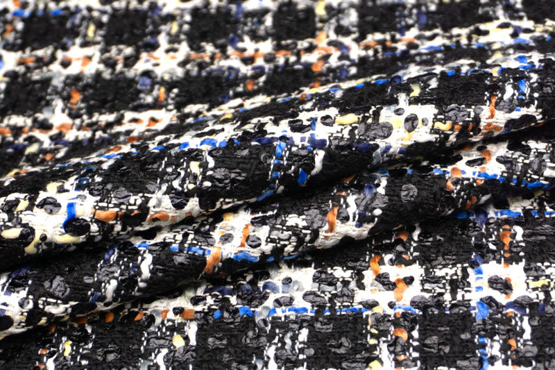 ふっくらとしたホワイトのスラブヤーンや、オフホワイトからイエローベージュ、ブルー、インディゴ、フレンチグレー、バーント シェンナ、ブリックへ変化するスラブヤーン、ブラックのラメ糸を絡めたブラックのスパイラルヤーン等を縦横にチェック状に行き交わせて、光沢のあるブラックのウレタンで、ドット状のプリントをあしらった逸品。