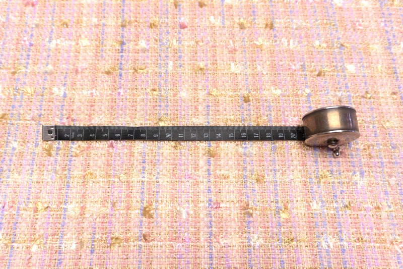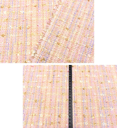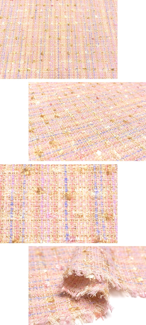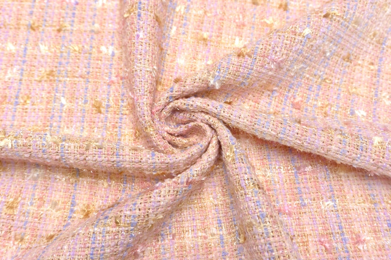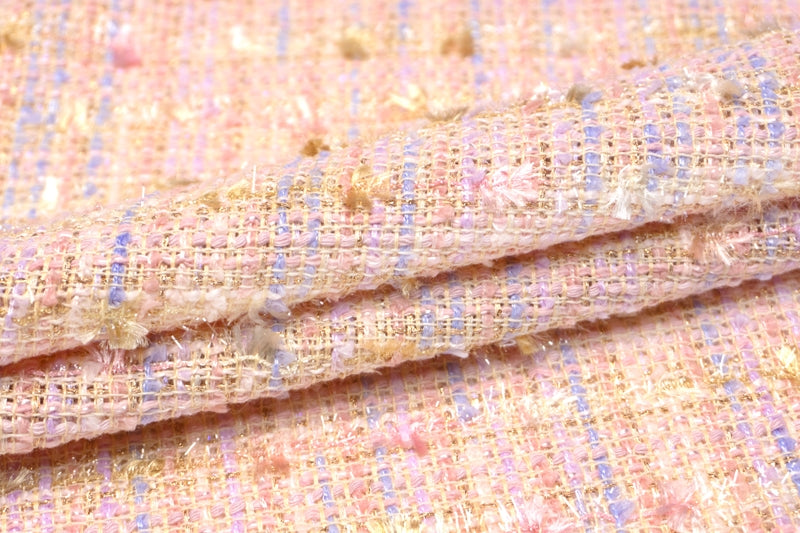 きらめく華やかなツイードにパステルカラーの毛足が豊かな表情を添えている、趣向性の高いお生地。