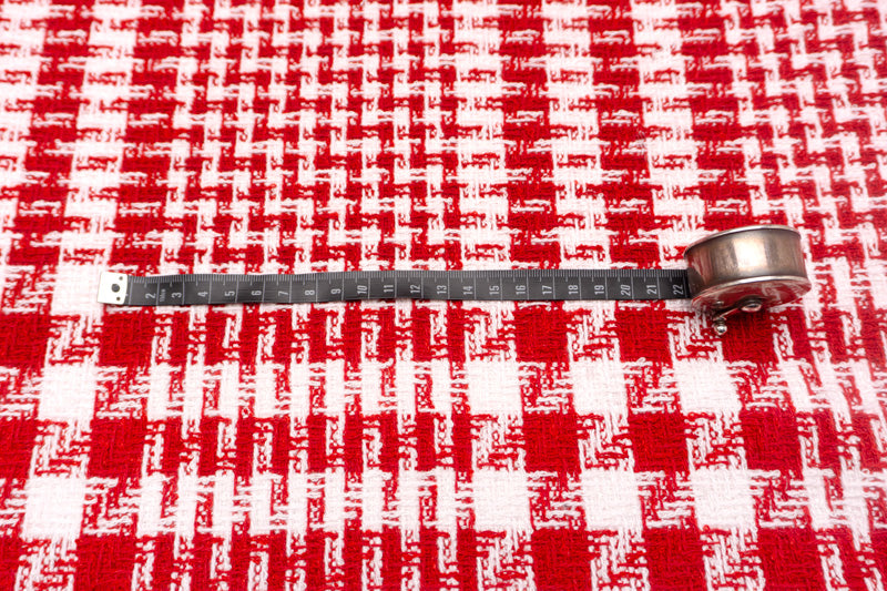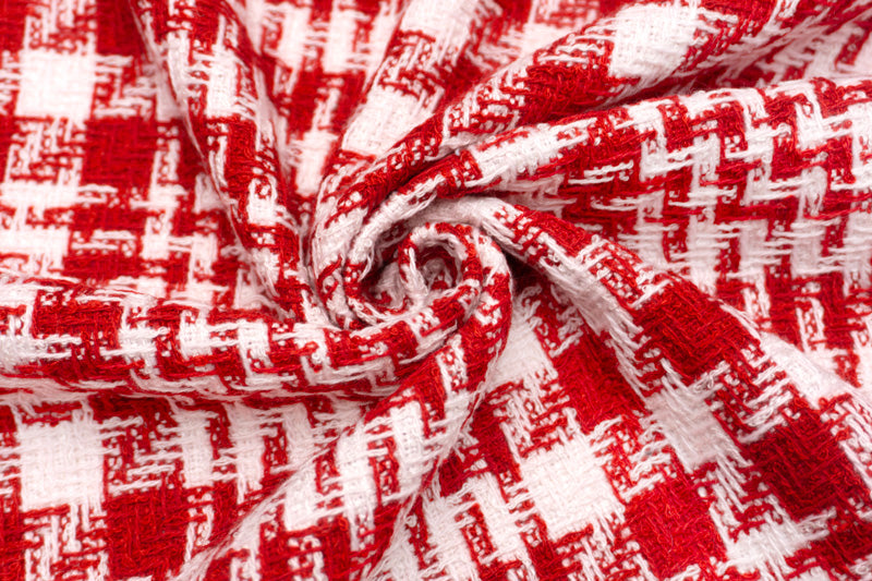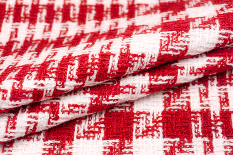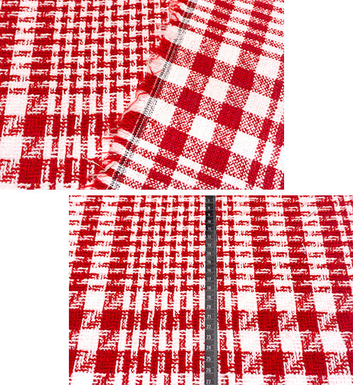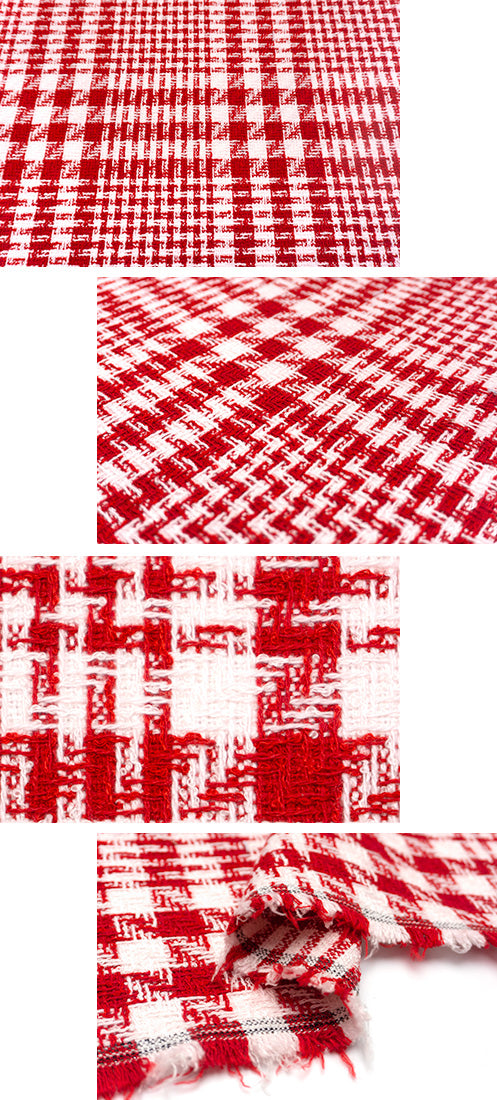 リップスティックレッドやホワイトのループヤーンをフラットなチェック柄に織り上げたベースに同じ2色のループヤーンをゆったりと行き交わせ、異なるチェック柄を重ねた逸品。
