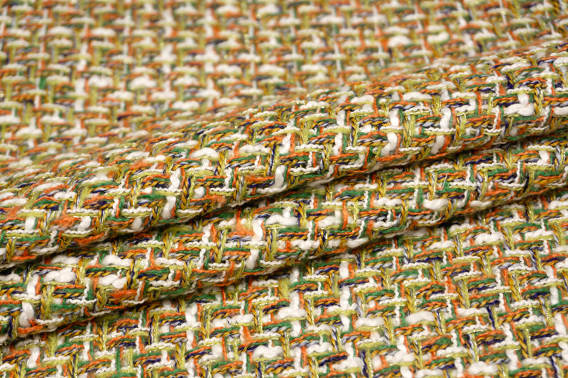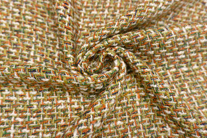 オフホワイトのふっくらとしたスラブヤーンや、オレンジとサマーグリーンの撚り糸、ホワイトとラベンダー、ネイビー、パンプキンの撚り糸、スモーキーモスとゴールドラメの撚り糸などを縦横にゆったりと行き交わせた逸品。