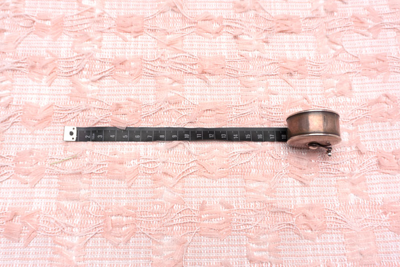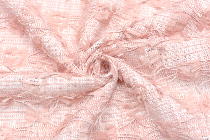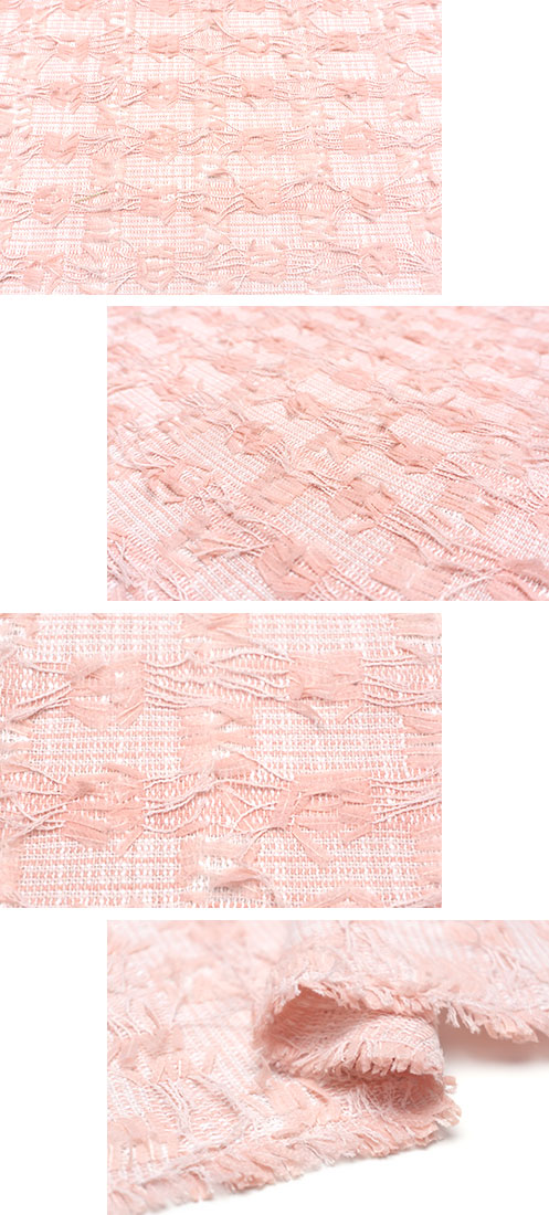 ピンクホワイトの糸とスモーキーピンクの不織布を横に並べ、ホワイトのスラブヤーンで縦に織り止め、横糸を等間隔に互い違いにカットし、リボンの様に仕上げた逸品。