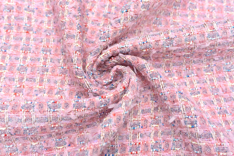 カラフルなヤーンが行き交う中に、優しい色合いのスウィートライラックのリボンが表面感と豊かな表情を沿えている、フェミニンで華やかなお生地。