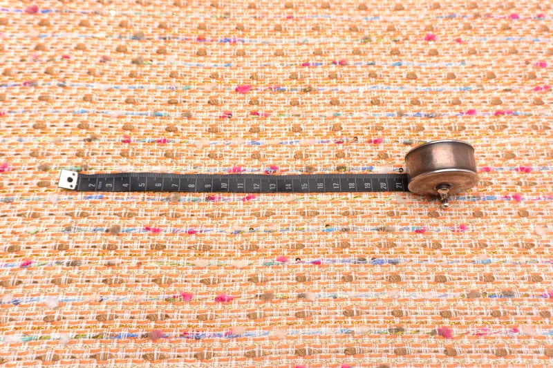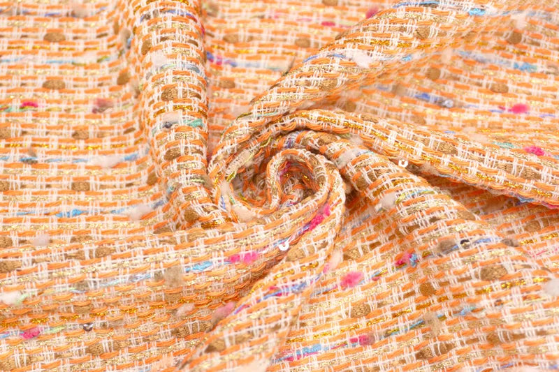 きらめきの中にふっくらとしたポンポンが浮かび上がり、カラフルな賑わいを添えている豊かな表情のお生地。