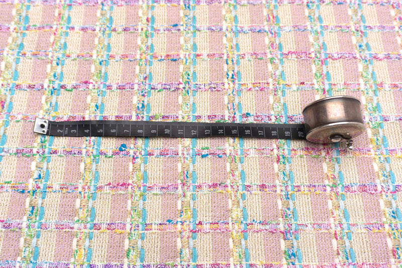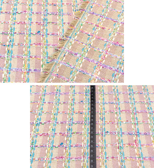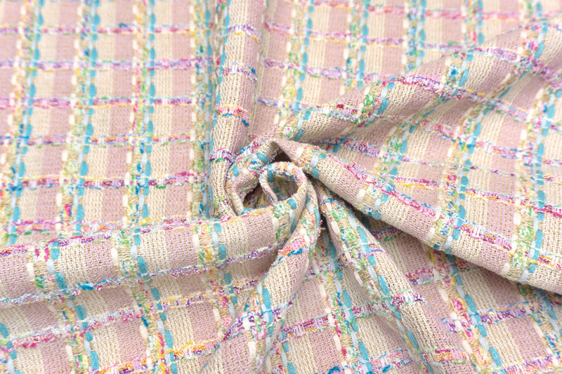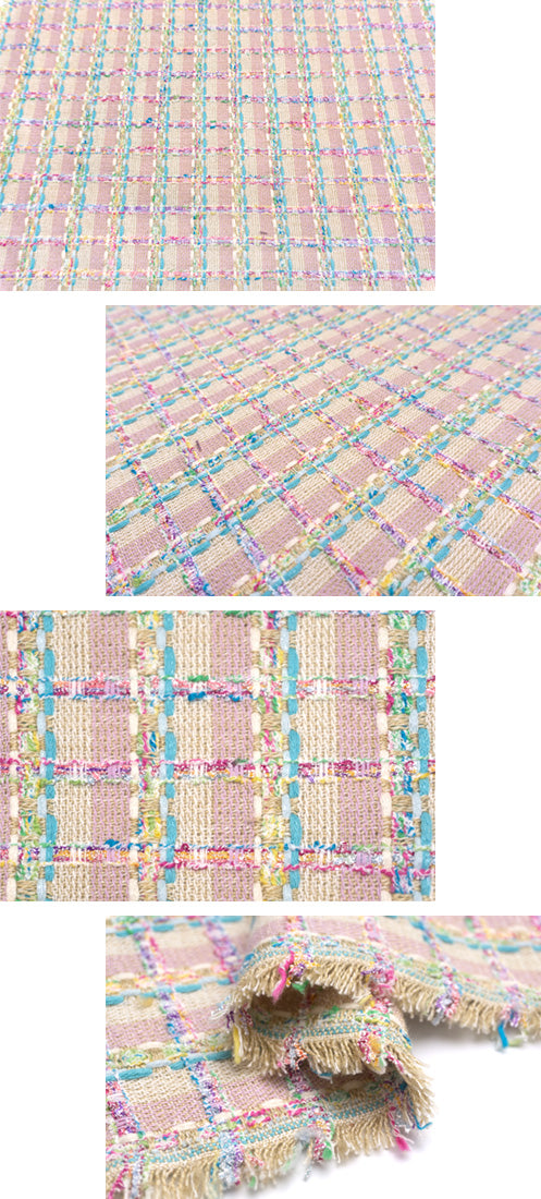 アイボリーやヌガー、ライラックでストライプにしたベースに、光沢の混ざる鮮やかなブルーターコイズやフロスティブルー、アイボリーのニットヤーンや、ラズベリーレッドやジョンブリアン、セルリアンブルー、バイオレット、光沢のあるホワイトが混ざるリングヤーン、パロットグリーンやスペアミント、セルリアンブルーへ変化する撚り糸等を縦横に行き交わせて、チェック柄を表現した逸品。