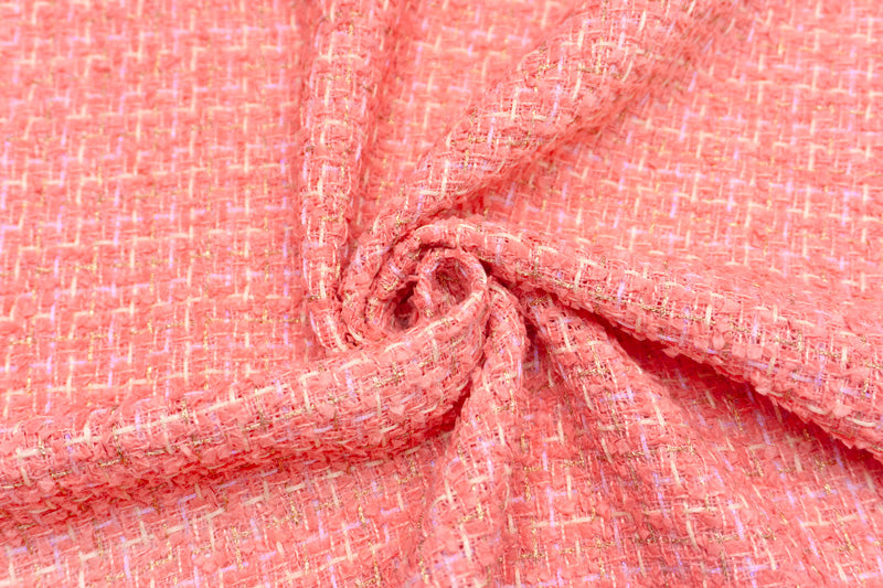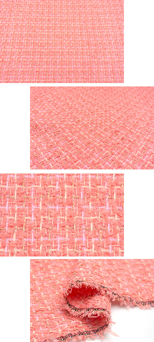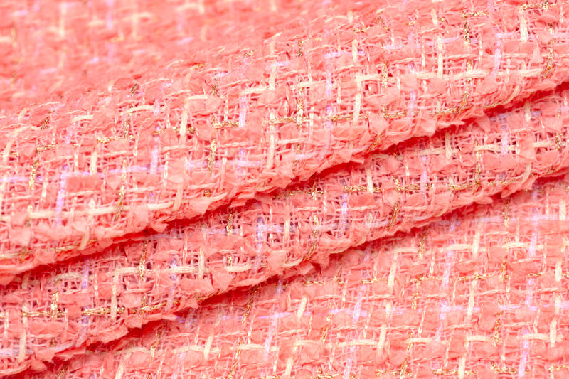 サーモンローズの色合いが引き立ち、きらきらが賑わう豊かな表情と表面感を添えているお生地。