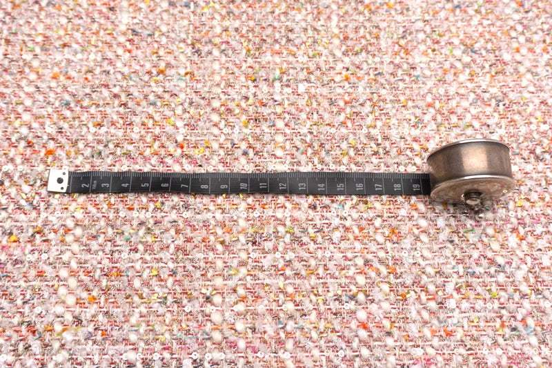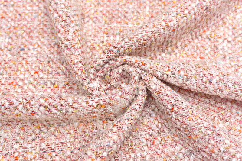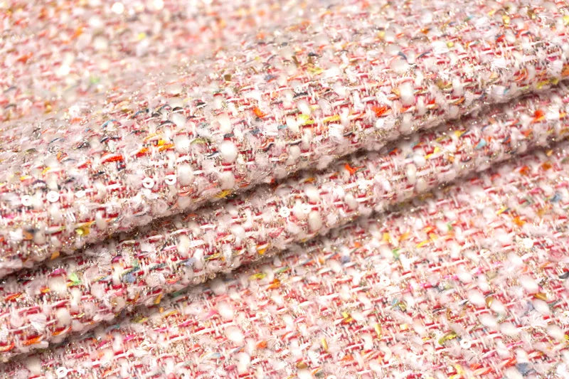 カラフルなヤーンやきらめきが賑わいのある存在感で豊かな表情と表面感を添えているお生地。